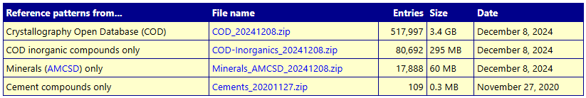 有三种不同的 COD 参考数据库包可供选择:完整的 COD 参考模式数据库包含 COD 中的所有相应条目,第二个数据包仅包含无机化合物(不含 C-H 键)的 COD 参考图谱,最后还有一个很小的参考数据库,仅包含水泥相的参考图谱。