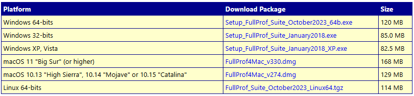 Match! 使用著名的Rietveld 程序 FullProf(J. Rodriguez-Carvajal, Physica B 192, 55 (1993))来运行Rietveld精细计算。您可以从原始的 FullProf 下载页面或从下面下载适用于所有平台(Windows、macOS、Linux 和 Linux 64 位)的 FullProf 安装程序。
